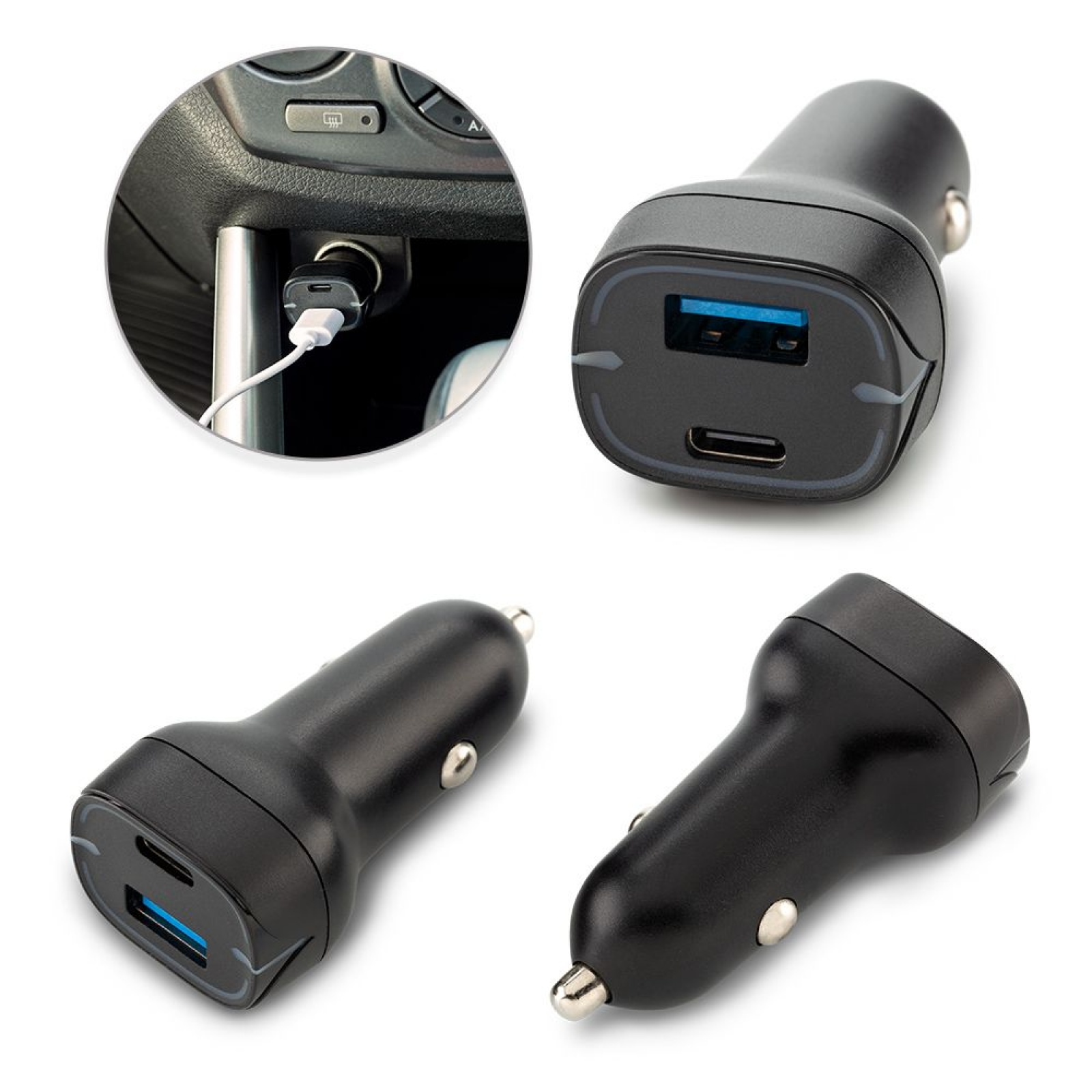 Cargador plástico dual para carro, con puertos USB y Tipo C. Empaque caja individual.