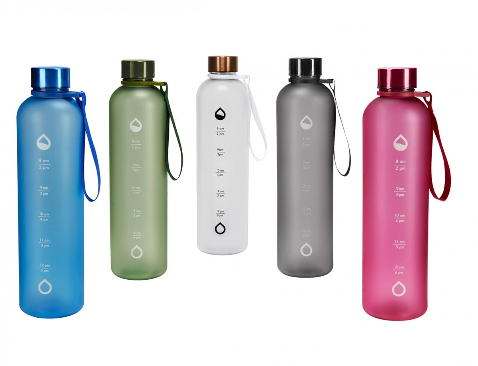 Tapa metalica con cierre de rosca. Aro de plastico con asa de tela. Cuerpo con terminado mate, suave al tacto y color frosty . Incluye marcador de tiempo para motivar tus habitos de hidratacion. Incluye caja individual.
