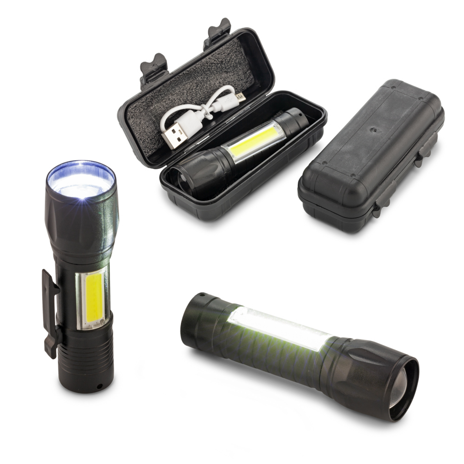 Linterna plástica de 1 LED 3W/80, luz lateral de 3W/130. Moviendo la cabeza de la linterna se puede hacer zoom in o zoom out para mayor precisión al momento de alumbrar. Resistente al agua. Entrada para carga tipo Micro USB. Incluye cable para cargar la batería. Estuche plástico.