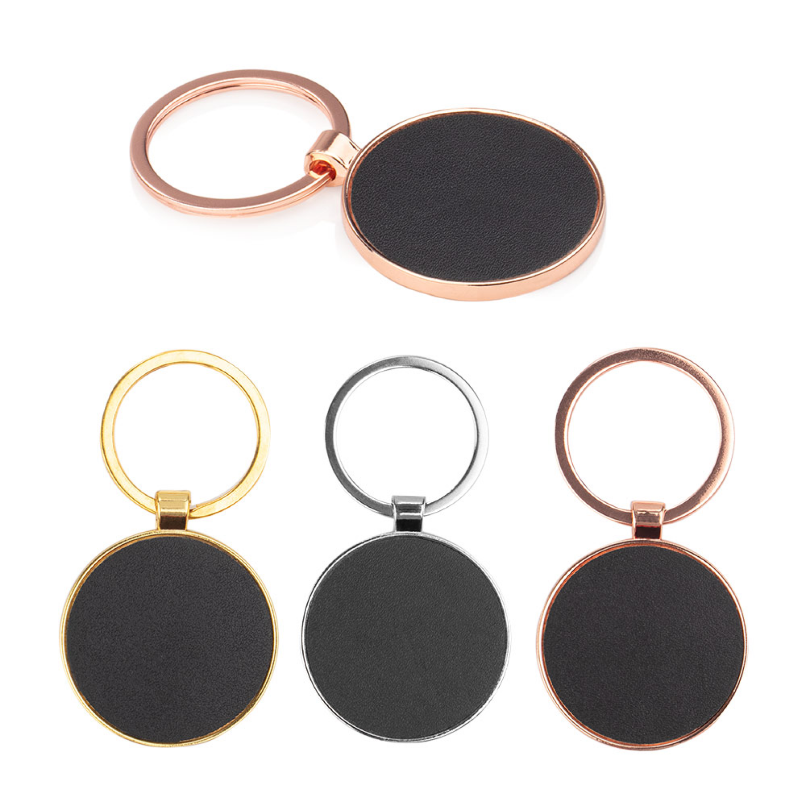 Llavero metálico rosa con forma redonda. Superficie oscura para marcación.
