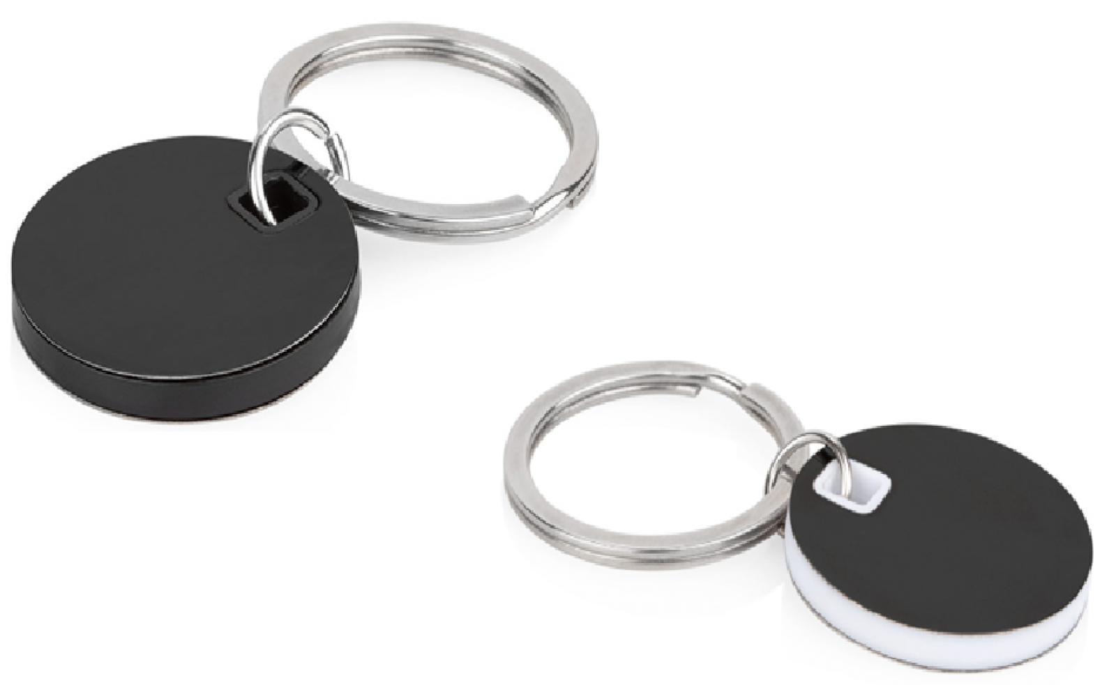 Llavero metálico con forma redonda. Diseño elegante de acabado bicolor, con detalles en plástico de alto contraste. Incluye anillo metálico resistente.