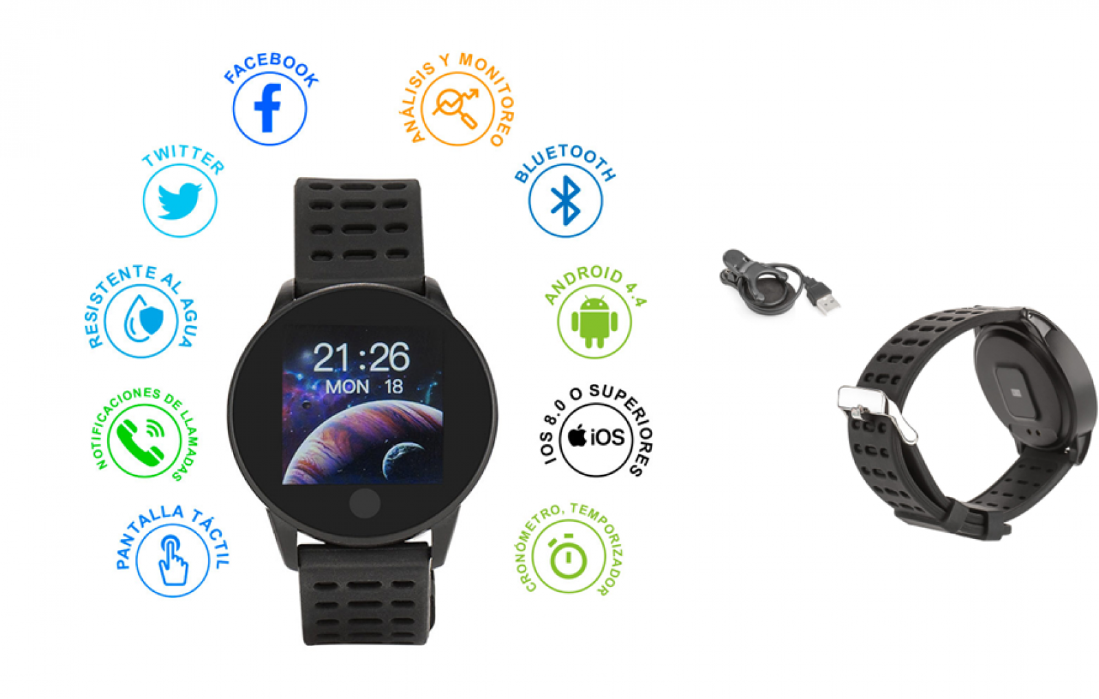 Reloj inteligente con pantalla táctil de 1,3" TFT Color. Realiza análisis y monitoreo del número de pasos, calorías, distancia, horas de sueño, nivel de fatiga, medición de oxígeno, frecuencia cardíaca y presión arterial. Incluye funciones de reloj, cronómetro, temporizador, control de música y multideporte. Recibe notificaciones de llamadas, WeChat, QQ, Facebook y Twitter. Resistente al agua (nivel IP67). Compatible con Bluetooth 4.2 y con sistemas operativos Android 4.4 y iOS 8.0 o superiores.